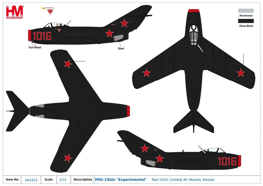 MIG-15bis “Experimental” Red, Combat Air Musem, Kansas Reg 1016 Diecast Metal Aircraft Model 1.72 Scale Hobbymaster HA2422
