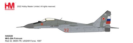 MIG-29A Fulcrum Red 960th FR, USSAR Force, 1997 Reg 32 Diecast Metal Aircraft Model 1/72 Scale Hobbymaster HA6520